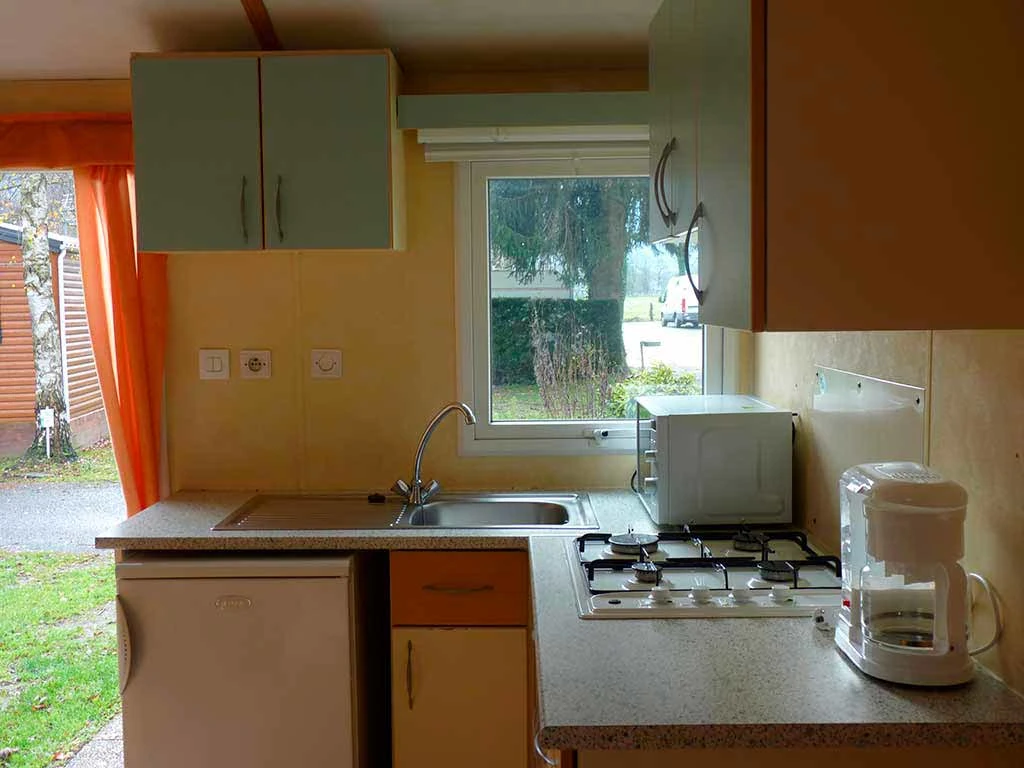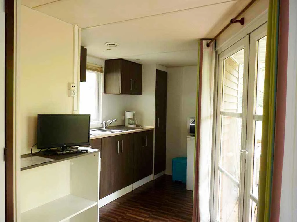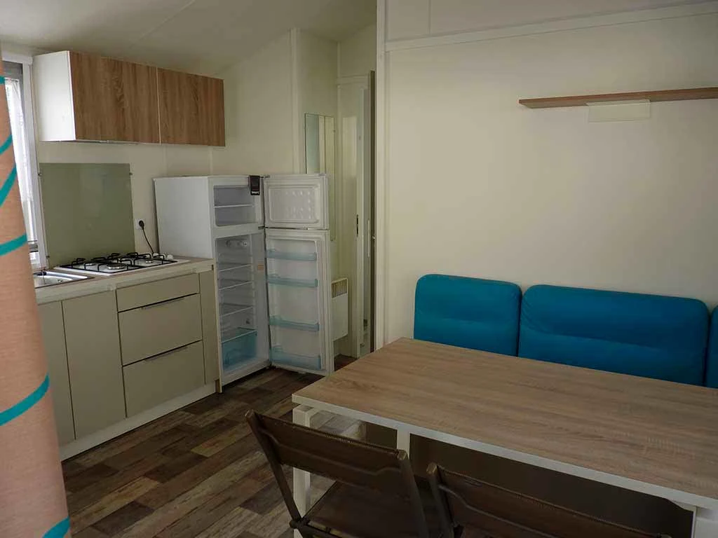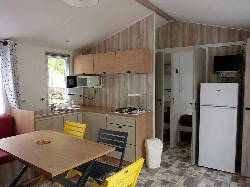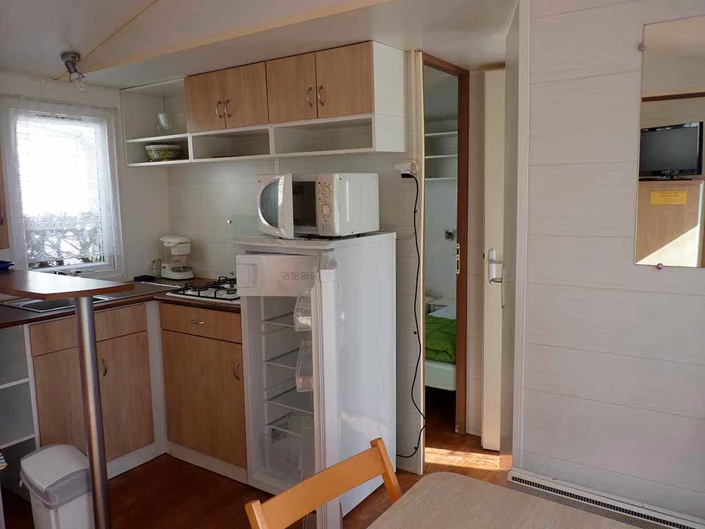 Pièce de vie attenante à la kitchenette équipée : réfrigérateur, micro-onde, gaz camping 2 feux, cafetière électrique, et toute la vaisselle adéquate, ainsi que le nécessaire à l'entretien durant votre séjour.